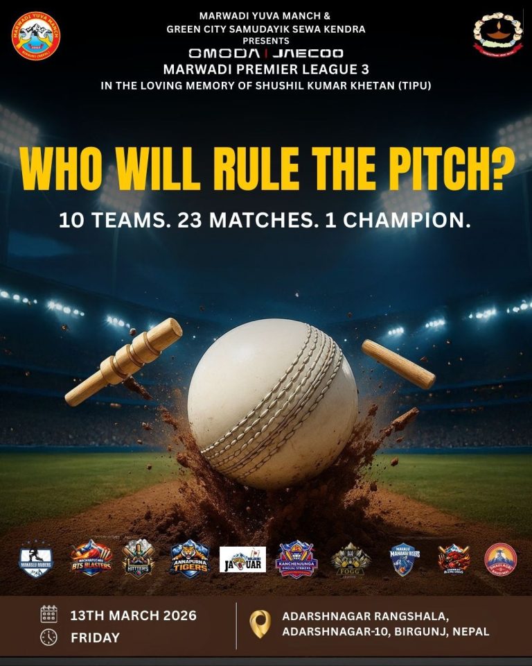 वीरगंज/२२ फागुन मारवाडी युवा मञ्च र ग्रीन सिटी सामुदायिक सेवा केन्द्र आदर्शनगरको संयुक्त आयोजनामा “मारवाडी प्रिमियर लिग–३” क्रिकेट प्रतियोगिता आयोजना हुने भएको....)