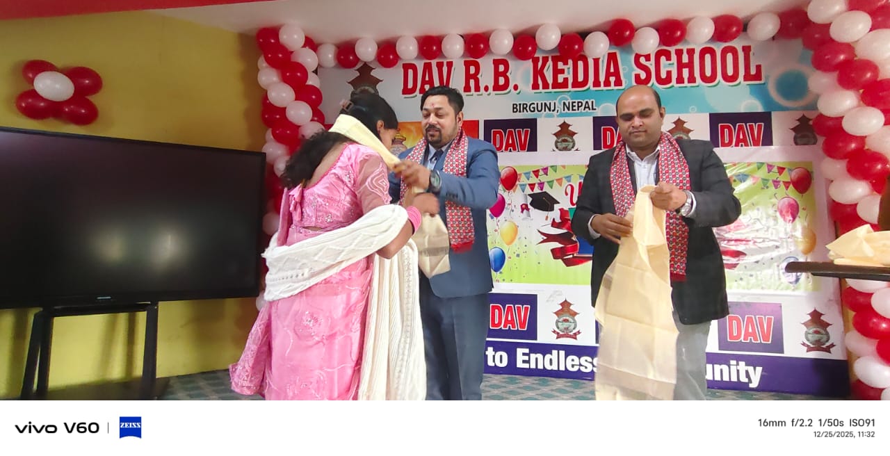 वीरगञ्जस्थित डिएभी आर.बी. केडिया स्कुलमा कक्षा ११ मा नवप्रवेश गरेका विद्यार्थीहरूको बिहीबार एक विशेष कार्यक्रमबीच भव्य स्वागत गरिएको छ। स्वागत कार्यक्रम विद्यालयका प्रिन्सिपल राकेश मिश्रको अध्यक्षतामा तथा माउन्ट मकालु बोर्डिङ स्कुलका प्रिन्सिपल एवं प्याब्सन महानगर अध्यक्ष राहुल श्रीवास्तवको प्रमुख आतिथ्यमा सम्पन्न भएको हो।